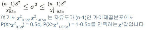- 모분산 σ2의 100(1-α)% 신뢰구간은