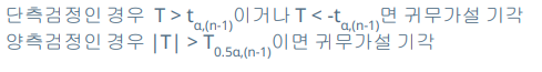 - 위의 두 식을 이용하여 검정통계량을 계산 후 각각 표준정규분포, t-분포를 이용한 기각역과 비교하여 검정