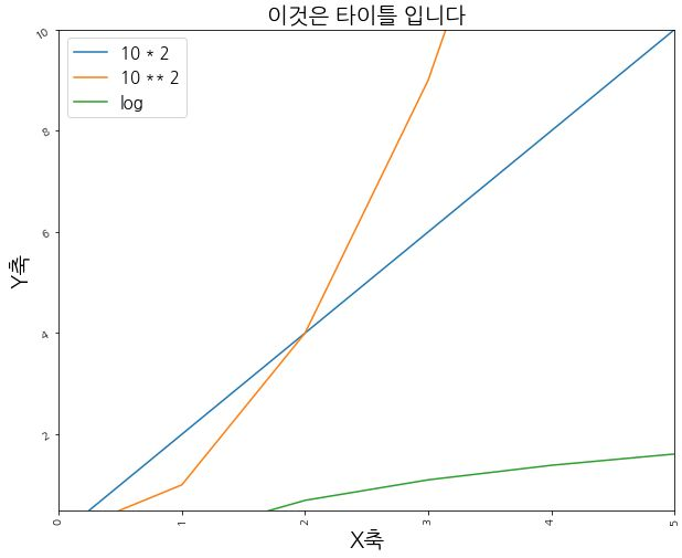 # X와 Y의 한계점(Limit) 설정: xlim(), ylim() plt.plot(np.arange(10), np.arange(10)*2) plt.plot(np.arange(10), np.arange(10)**2) plt.plot(np.arange(10), np.log(np.arange(10))) # 타이틀 & font 설정 plt.title('이것은 타이틀 입니다', fontsize=20) # X축 & Y축 Label 설정 plt.xlabel('X축', fontsize=20) plt.ylabel('Y축', fontsize=20) # X tick, Y tick 설정 plt.xticks(rotation=90) plt.yticks(rotation=30) # legend 설정 plt.legend(['10 * 2', '10 ** 2', 'log'], fontsize=15) # x, y limit 설정 plt.xlim(0, 5) plt.ylim(0.5, 10) plt.show()