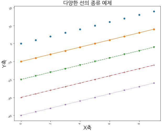 # 마커(marker) # '.': point marker # 'o': circle marker # 'v': triangle_down marker # '+': plus marker # '*': star marker plt.plot(np.arange(10), np.arange(10)*2 + 10, marker='.', markersize=10) plt.plot(np.arange(10), np.arange(10)*2, marker='o', markersize=10) plt.plot(np.arange(10), np.arange(10)*2 - 10, marker='v', markersize=10) plt.plot(np.arange(10), np.arange(10)*2 - 20, marker='+', markersize=15) plt.plot(np.arange(10), np.arange(10)*2 - 30, marker='*', markersize=20) # 타이틀 & font 설정 plt.title('마커 설정 예제', fontsize=20) # X축 & Y축 Label 설정 plt.xlabel('X축', fontsize=20) plt.ylabel('Y축', fontsize=20) # X tick, Y tick 설정 plt.xticks(rotation=90) plt.yticks(rotation=30) plt.show() #--------- # 라인(line) # '-': solid line style # '--': dashed line style # '-.': dash-dot line style # ':': dotted line style plt.plot(np.arange(10), np.arange(10)*2, marker='o', linestyle='') plt.plot(np.arange(10), np.arange(10)*2 - 10, marker='o', linestyle='-') plt.plot(np.arange(10), np.arange(10)*2 - 20, marker='v', linestyle='--') plt.plot(np.arange(10), np.arange(10)*2 - 30, marker='+', linestyle='-.') plt.plot(np.arange(10), np.arange(10)*2 - 40, marker='*', linestyle=':') # 타이틀 & font 설정 plt.title('다양한 선의 종류 예제', fontsize=20) # X축 & Y축 Label 설정 plt.xlabel('X축', fontsize=20) plt.ylabel('Y축', fontsize=20) # X tick, Y tick 설정 plt.xticks(rotation=90) plt.yticks(rotation=30) plt.show() #--------------- # 컬러(color) # 'b': blue # 'g': green # 'r': red # 'c': cyan # 'm': magenta # 'y': yellow # 'k': black # 'w': white # alpha를 통해 투명도를 조절할 수 있습니다. plt.plot(np.arange(10), np.arange(10)*2, marker='o', linestyle='-', color='b', alpha=.1) plt.plot(np.arange(10), np.arange(10)*2 - 10, marker='v', linestyle='--', color='c', alpha=.3) plt.plot(np.arange(10), np.arange(10)*2 - 20, marker='+', linestyle='-.', color='y', alpha=.8) plt.plot(np.arange(10), np.arange(10)*2 - 30, marker='*', linestyle=':', color='r', alpha=1.) # 타이틀 & font 설정 plt.title('색상 설정 예제', fontsize=20) # X축 & Y축 Label 설정 plt.xlabel('X축', fontsize=20) plt.ylabel('Y축', fontsize=20) # X tick, Y tick 설정 plt.xticks(rotation=90) plt.yticks(rotation=30) plt.show()