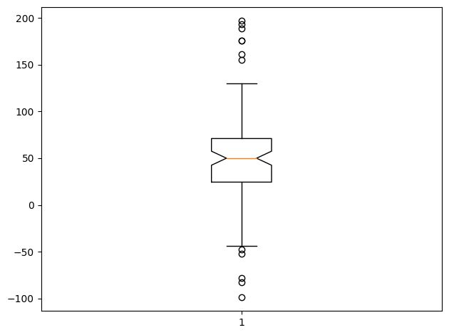 # box plot # 샘플 데이터 생성 spread = np.random.rand(50) * 100 center = np.ones(25) * 50 flier_high = np.random.rand(10) * 100 + 100 flier_low = np.random.rand(10) * -100 data = np.concatenate((spread, center, flier_high, flier_low)) # 기본 박스플롯 생성 plt.boxplot(data, notch=True) plt.tight_layout() plt.show()