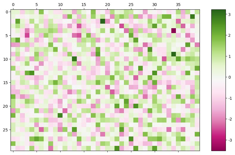 # Heatmap import matplotlib.pyplot as plt import numpy as np arr = np.random.standard_normal((30, 40)) # 컬러맵 종류 지정 cmap = plt.get_cmap('PiYG') # cmap = plt.get_cmap('BuGn') # cmap = plt.get_cmap('Greys') # cmap = plt.get_cmap('bwr') plt.matshow(arr, cmap=cmap) plt.colorbar(shrink=0.8, aspect=10) plt.show()