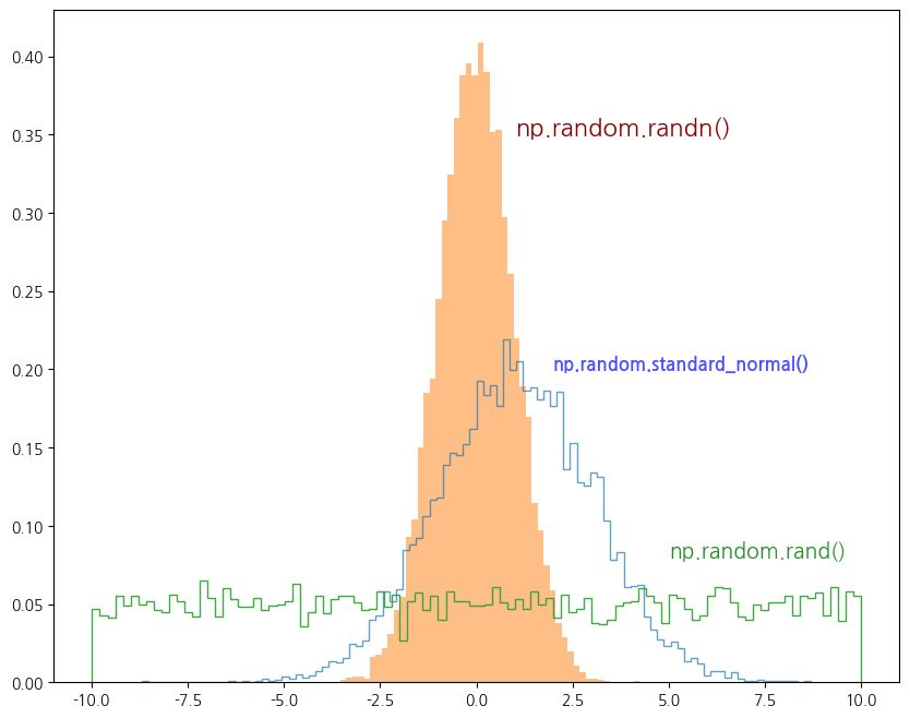 # 텍스트 삽입하기 import matplotlib.pyplot as plt import numpy as np a = 2.0 * np.random.randn(10000) + 1.0 b = np.random.standard_normal(10000) c = 20.0 * np.random.rand(5000) - 10.0 font1 = {'color': 'darkred', 'weight': 'normal', 'size': 16} font2 = {'color': 'blue', 'weight': 'bold', 'size': 12, 'alpha': 0.7} font3 = {'color': 'forestgreen', 'style': 'italic', 'size': 14} plt.hist(a, bins=100, density=True, alpha=0.7, histtype='step') plt.text(1.0, 0.35, 'np.random.randn()', fontdict=font1) plt.hist(b, bins=50, density=True, alpha=0.5, histtype='stepfilled') plt.text(2.0, 0.20, 'np.random.standard_normal()', fontdict=font2) plt.hist(c, bins=100, density=True, alpha=0.9, histtype='step') plt.text(5.0, 0.08, 'np.random.rand()', fontdict=font3) plt.show()