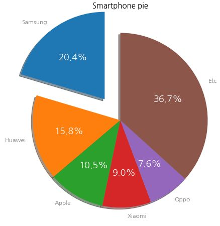 - texts는 label에 대한 텍스트 효과를, autotexts는 파이 위에 그려지는 텍스트 효과를 다룰 때 활용labels = ['Samsung', 'Huawei', 'Apple', 'Xiaomi', 'Oppo', 'Etc'] sizes = [20.4, 15.8, 10.5, 9, 7.6, 36.7] explode = (0.3, 0, 0, 0, 0, 0) # texts, autotexts 인자를 활용하여 텍스트 스타일링을 적용 patches, texts, autotexts = plt.pie(sizes, explode=explode, labels=labels, # autopct='%.2f%%', autopct='%.1f%%', shadow=True, startangle=90) plt.title('Smartphone pie', fontsize=15) # label 텍스트에 대한 스타일 적용 for t in texts: t.set_fontsize(12) t.set_color('gray') # pie 위의 텍스트에 대한 스타일 적용 for t in autotexts: t.set_color("white") t.set_fontsize(18) plt.show()