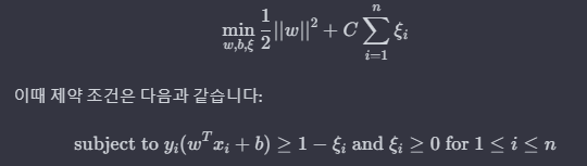 - 결정 경계 이후 : 1 < 슬랙변수 ,, = 이 경우는 올바르지 못한 클래스로 분류