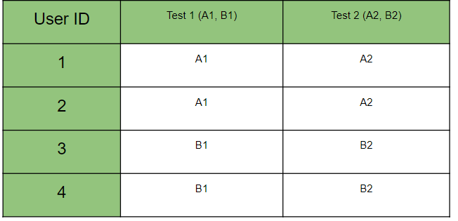 - 예를 들어 4명의 사용자를 대상으로 2개의 테스트를 동시에 진행한다고 가정