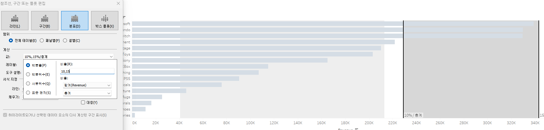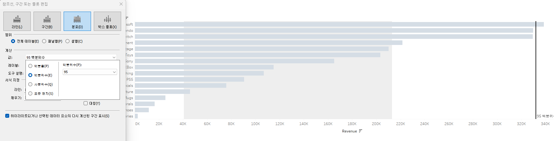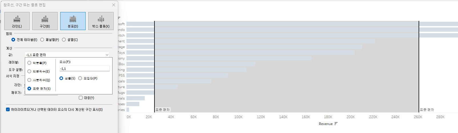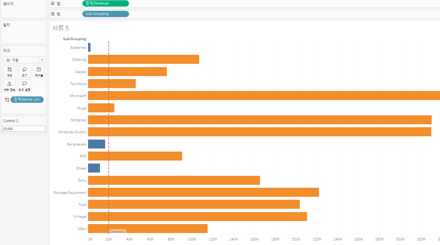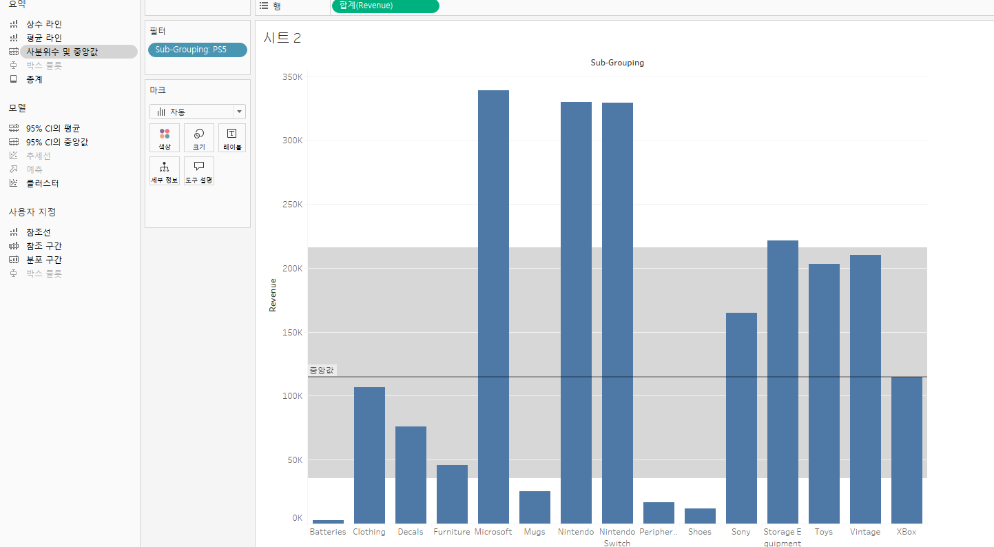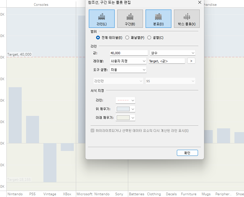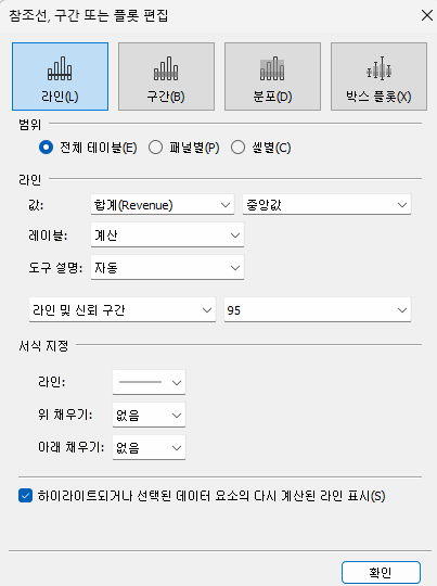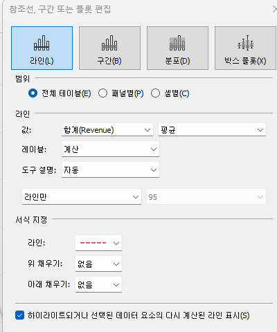 참조선을 만들고 계산 필드로 T/F 를 만들면 매개변수에 따라 조정할 수 있게 되어 좋다.